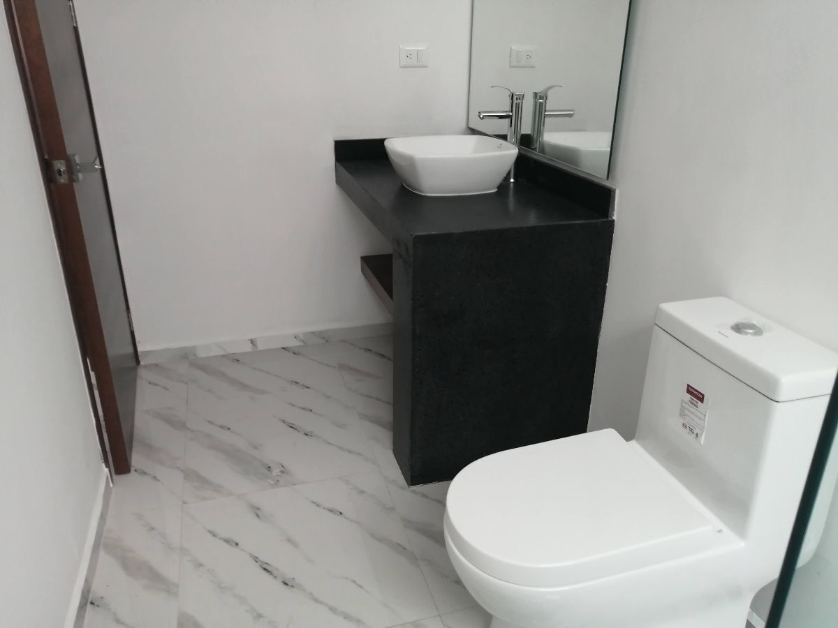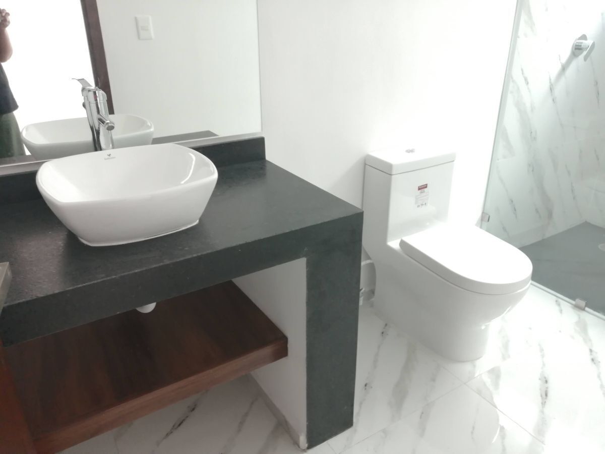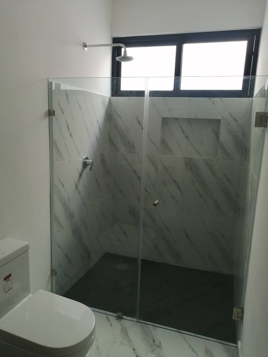 Baño completo con modernos canceles de vidrio para tu comodidad.