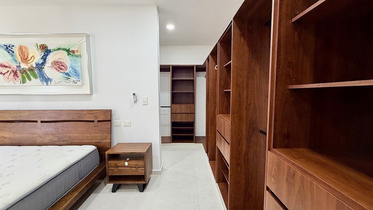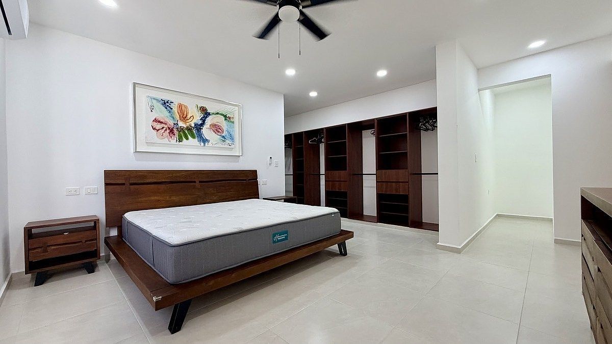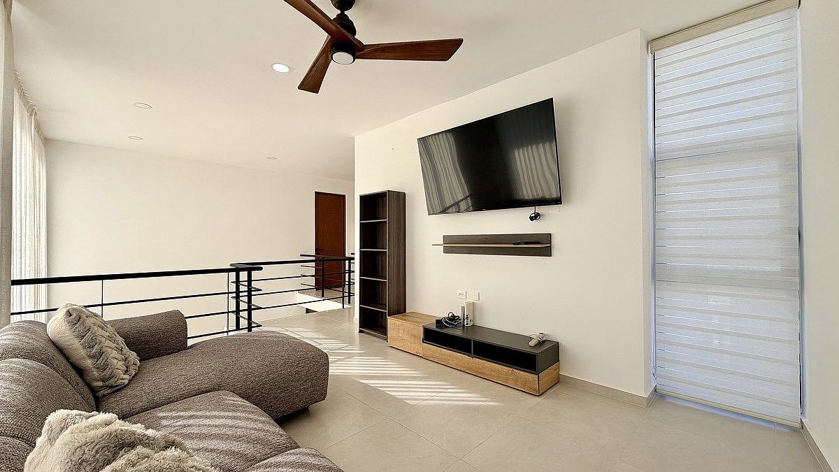 Planta alta: Recámara principal con clóset, vestidor y amplio baño, recámara secundaria con baño completo, sala de TV con terraza y vista a la alberca, cuarto de blancos.
