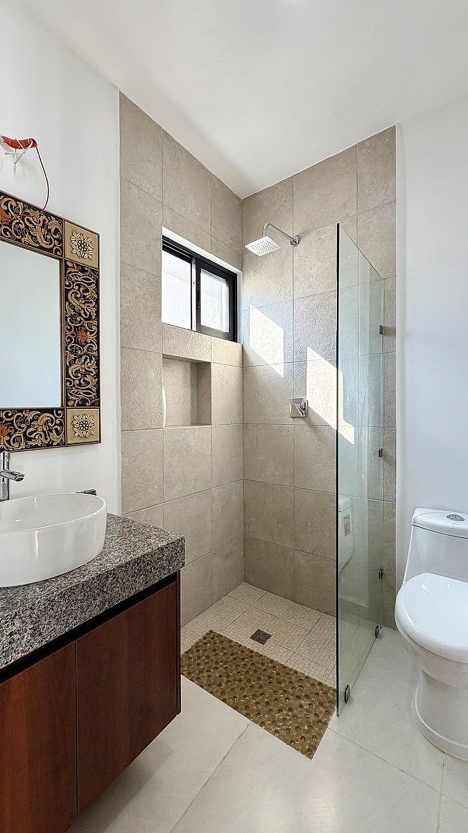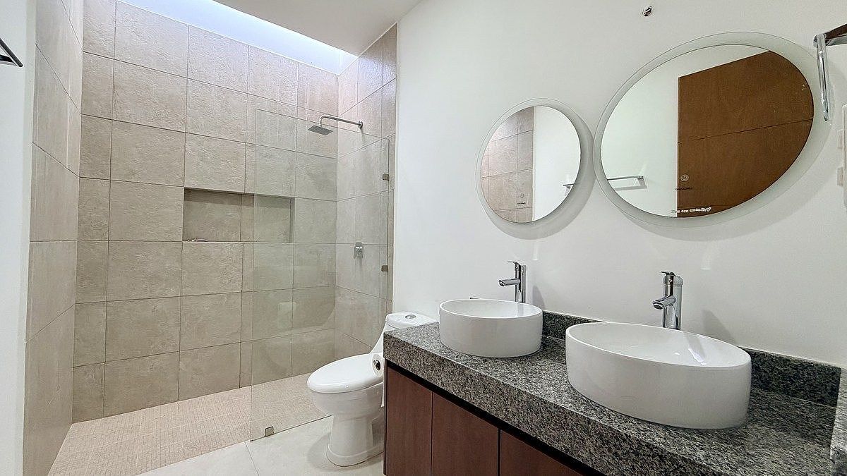Alberca con acabado chukum, cocina integral con electrodomésticos, carpintería, aires acondicionados, ventiladores, iluminación interior y exterior, canceles de cristal templado, biodigestor, cisterna, paisajismo e iluminación arquitectónica.